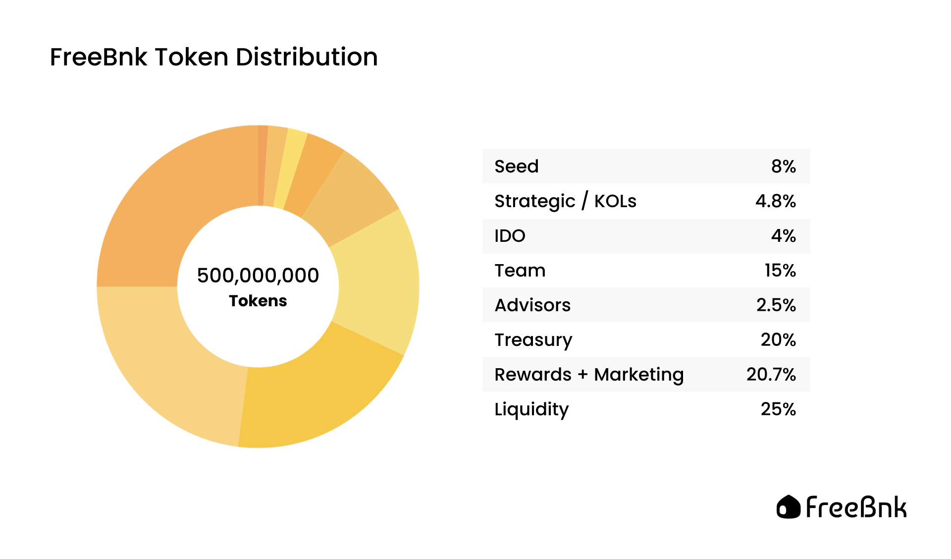 The total supply of FRBK is capped at **500,000,000 tokens**, ensuring scarcity and long-term value. The allocation of tokens is structured to support the sustainable growth of the Freebnk ecosystem and its community.